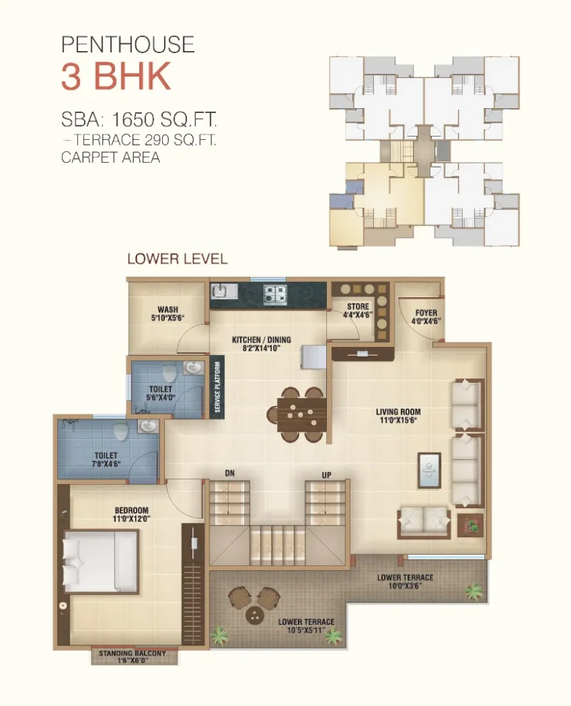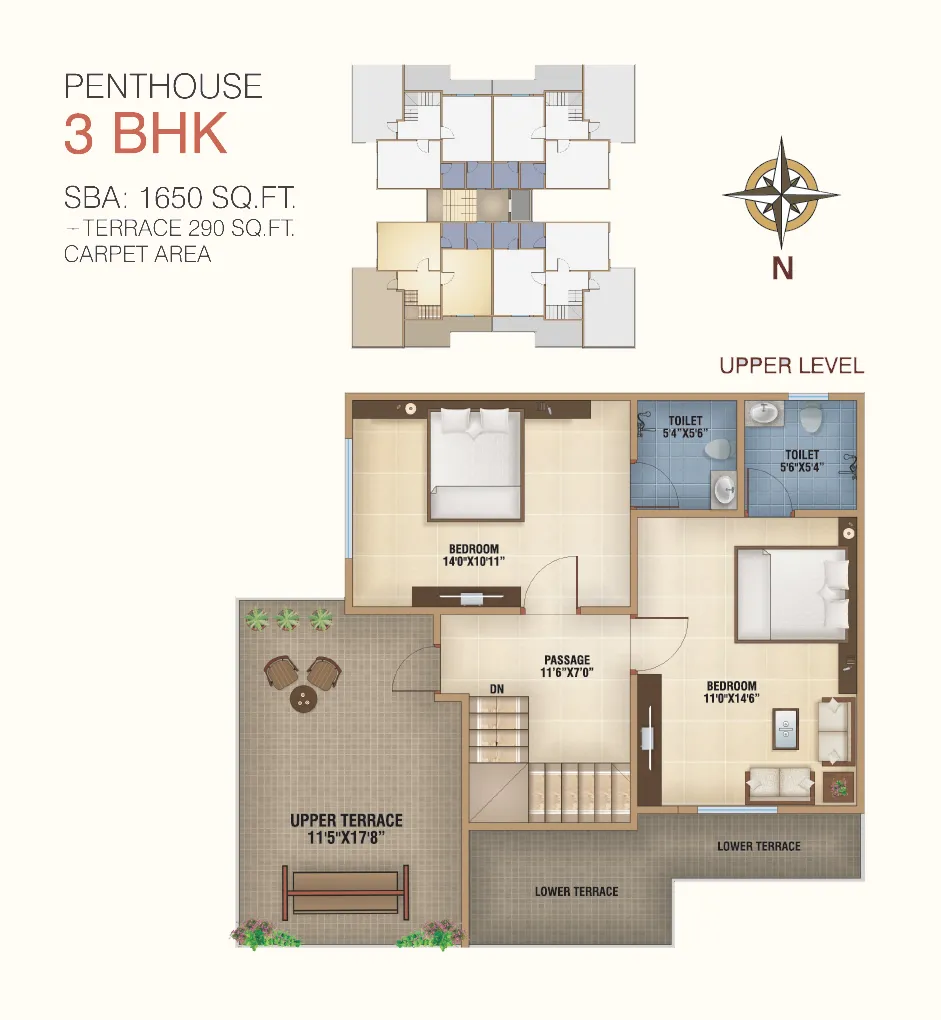 3BHK Penthouse Floor Plan, S.B.A: 1650 SQ. FT. +Terrace 290 SQ. FT Carpet Area.